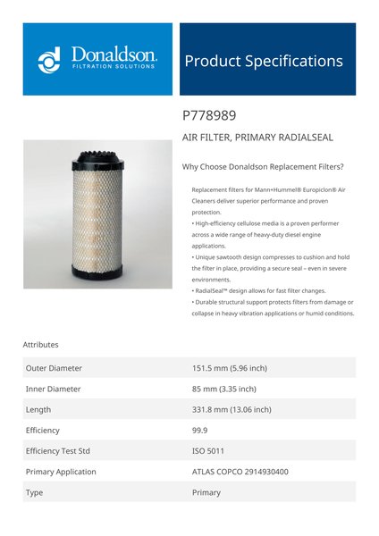 Donaldson P778989 Air Filter, Primary Radialseal | Replaces the Ingersoll Rand 89232474