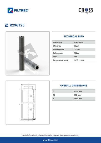Engineered with their high performance media and a durable design, the R296T25 provides reliable and consistent performance over its lifespan, even in harsh operating environments. When you order from FilterFinder, you can trust that you are getting a reliable and high-quality replacement filter that will keep your system running smoothly.