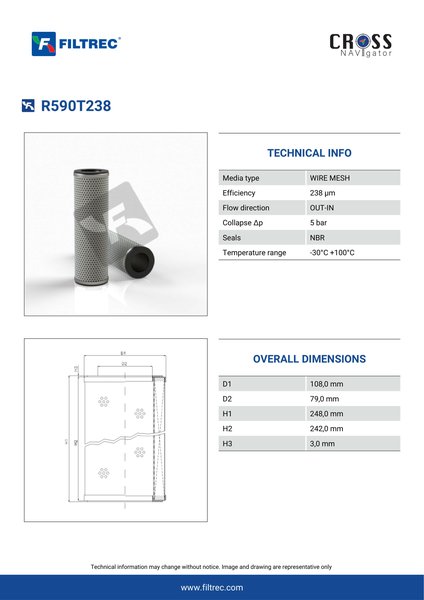 Genuine Filtrec R590T238. This Filtrec element is designed to meet or exceed the quality and performance of brand OEM’s ensuring superior filtration performance and long-lasting durability.