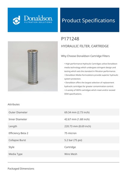 Genuine Donaldson P171248 Hydraulic Filter, Cartridge is designed to provide superior protection for your hydraulic system, effectively capturing contaminants to ensure clean fluid circulation. With high-quality filtration media, it extends equipment life, improves operational efficiency, and maintains fluid cleanliness even in the most demanding environments.