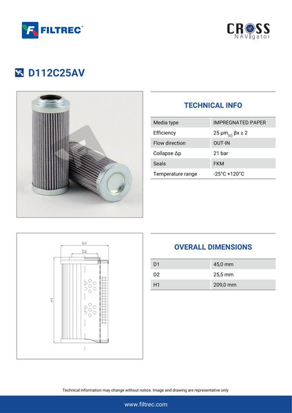 Genuine Filtrec D112C25AV. This Filtrec element is designed to meet or exceed the quality and performance of brand OEM’s ensuring superior filtration performance and long-lasting durability.