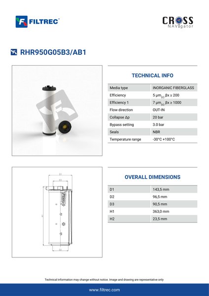 Genuine Filtrec RHR950G05B3/AB1. This Filtrec element is designed to meet or exceed the quality and performance of brand OEM’s ensuring superior filtration performance and long-lasting durability.Engineered with their high performance media and a durable design, the RHR950G05B3/AB1 provides reliable and consistent performance over its lifespan, even in harsh operating environments. When you order from FilterFinder, you can trust that you are getting a reliable and high-quality replacement filter that will keep your system running smoothly.