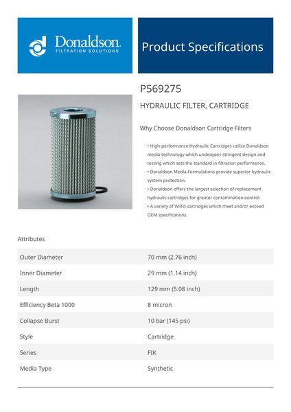 Genuine Donaldson P569275 Hydraulic Filter, Cartridge is designed to provide superior protection for your hydraulic system, effectively capturing contaminants to ensure clean fluid circulation. With high-quality filtration media, it extends equipment life, improves operational efficiency, and maintains fluid cleanliness even in the most demanding environments.