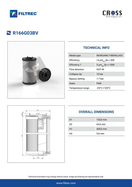 Genuine Filtrec R166G03BV. This Filtrec element is designed to meet or exceed the quality and performance of brand OEM’s ensuring superior filtration performance and long-lasting durability.Engineered with their high performance media and a durable design, the R166G03BV provides reliable and consistent performance over its lifespan, even in harsh operating environments. When you order from FilterFinder, you can trust that you are getting a reliable and high-quality replacement filter that will keep your system running smoothly.
