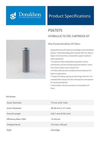 Genuine Donaldson P567075 Hydraulic Filter, Cartridge Dt is engineered with advanced depth filtration technology, offering enhanced dirt retention and fluid cleanliness. It ensures optimal performance in high-pressure hydraulic systems, effectively protecting critical components from wear and extending system life.This filters robust construction and superior filtration efficiency make it ideal for demanding applications. Its reliable performance helps minimize maintenance costs and system downtime, ensuring consistent operation under tough conditions.