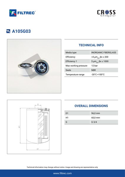 Genuine Filtrec A105G03. This Filtrec element is designed to meet or exceed the quality and performance of brand OEM’s ensuring superior filtration performance and long-lasting durability.