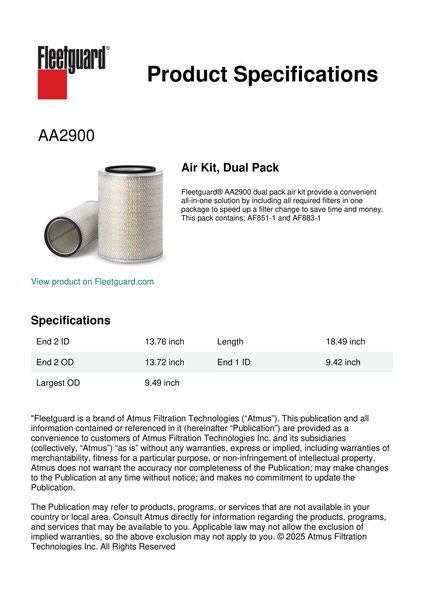 Fleetguard® AA2900 dual pack air kit provide a convenient all-in-one solution by including all required filters in one package to speed up a filter change to save time and money. This pack contains: AF851-1 and AF883-1Specification
