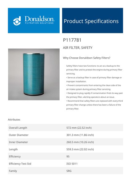 Why Choose Donaldson Safety Filters?Safety filters have two functions: to act as a backup to the primary filter and to protect the engine during primary filter servicing.