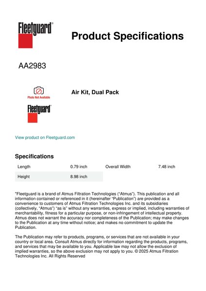 Fleetguard® AA2983 meets or exceeds OE performance requirements and the new challenges of modern engine technology.Specification