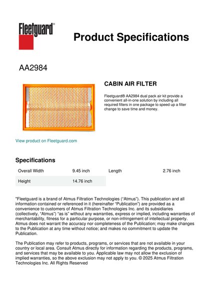 Fleetguard® AA2984 dual pack air kit provide a convenient all-in-one solution by including all required filters in one package to speed up a filter change to save time and money.Specification