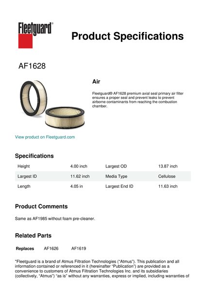 Fleetguard® AF1628 premium axial seal primary air filter ensures a proper seal and prevent leaks to prevent airborne contaminants from reaching the combustion chamber.