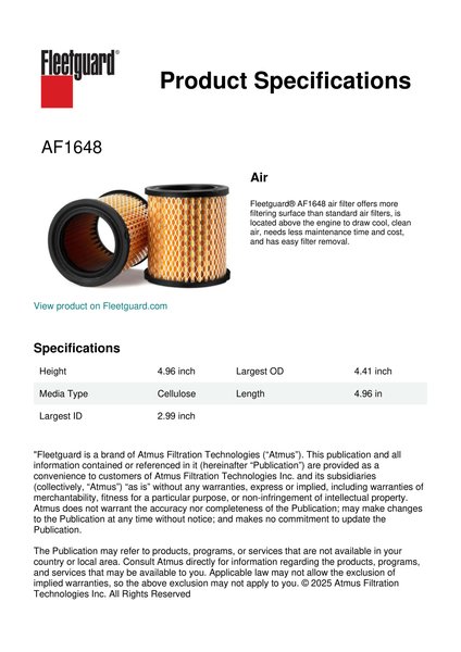Fleetguard® AF1648 air filter offers more filtering surface than standard air filters, is located above the engine to draw cool, clean air, needs less maintenance time and cost, and has easy filter removal.Specification