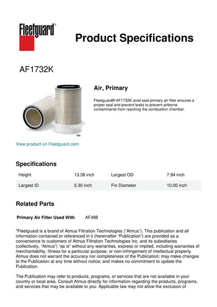 Fleetguard® AF1732K axial seal primary air filter ensures a proper seal and prevent leaks to prevent airborne contaminants from reaching the combustion chamber.Specification