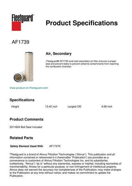 .Fleetguard® AF1739 axial seal secondary air filter ensures a proper seal and prevent leaks to prevent airborne contaminants from reaching the combustion chamber.