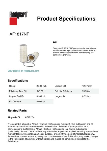 Fleetguard® AF1817NF premium axial seal primary air filter ensures a proper seal and prevent leaks to prevent airborne contaminants from reaching the combustion chamber.