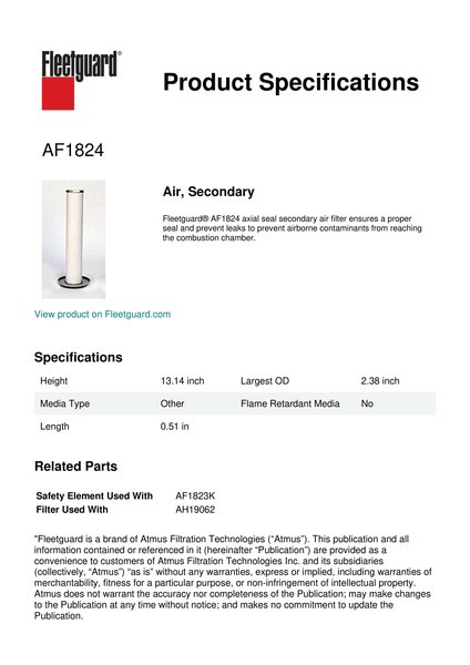 Fleetguard® AF1824 axial seal secondary air filter ensures a proper seal and prevent leaks to prevent airborne contaminants from reaching the combustion chamber.Specification