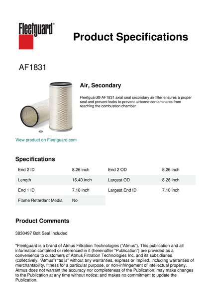 Fleetguard® AF1831 axial seal secondary air filter ensures a proper seal and prevent leaks to prevent airborne contaminants from reaching the combustion chamber.