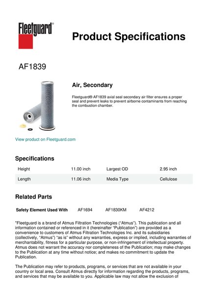 Fleetguard AF1839 Air, Secondary