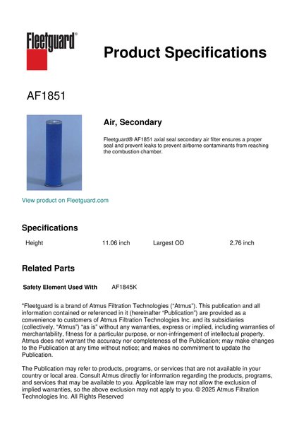 Fleetguard AF1851 Replacement Air, Secondary