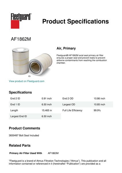 Fleetguard® AF1862M axial seal primary air filter ensures a proper seal and prevent leaks to prevent airborne contaminants from reaching the combustion chamber.