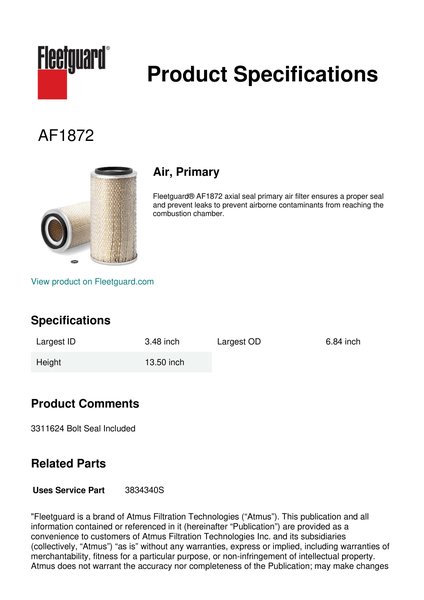 Fleetguard® AF1872 axial seal primary air filter ensures a proper seal and prevent leaks to prevent airborne contaminants from reaching the combustion chamber.