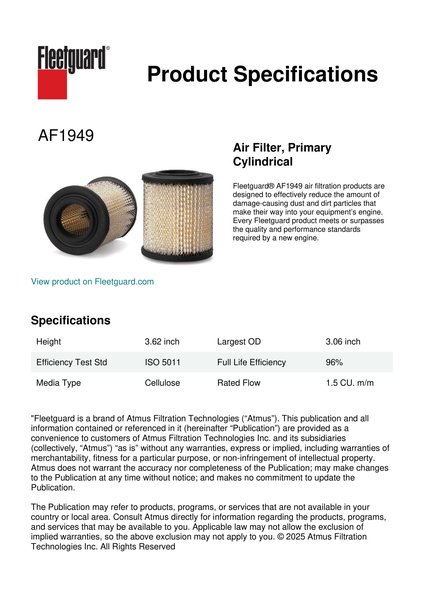 Fleetguard® AF1949 air filtration products are designed to effectively reduce the amount of damage-causing dust and dirt particles that make their way into your equipment’s engine. Every Fleetguard product meets or surpasses the quality and performance standards required by a new engine.Specification