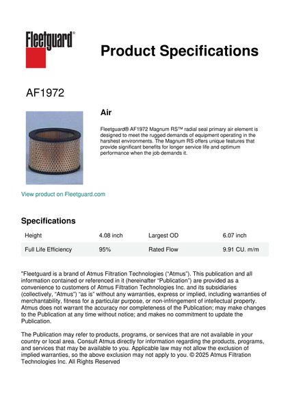 Fleetguard® AF1972 Magnum RS™ radial seal primary air element is designed to meet the rugged demands of equipment operating in the harshest environments. The Magnum RS offers unique features that provide significant benefits for longer service life and optimum performance when the job demands it.Specification