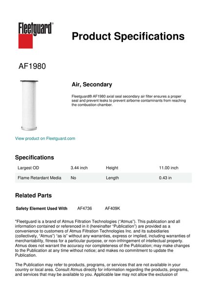 Fleetguard® AF1980 axial seal secondary air filter ensures a proper seal and prevent leaks to prevent airborne contaminants from reaching the combustion chamber.Specification