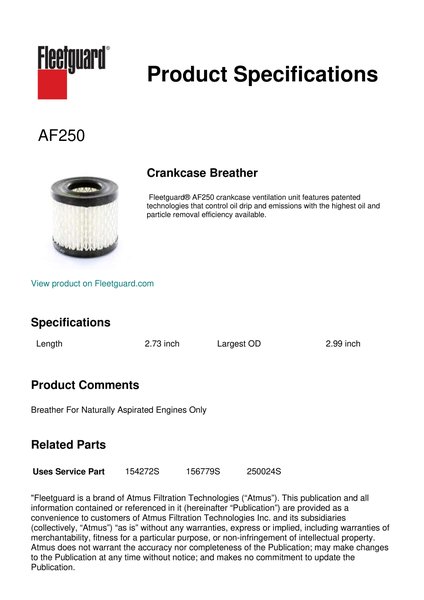 Fleetguard® AF250 crankcase ventilation unit features patented technologies that control oil drip and emissions with the highest oil and particle removal efficiency available.Specification