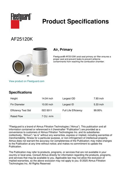 Fleetguard® AF25120K axial seal primary air filter ensures a proper seal and prevent leaks to prevent airborne contaminants from reaching the combustion chamber.