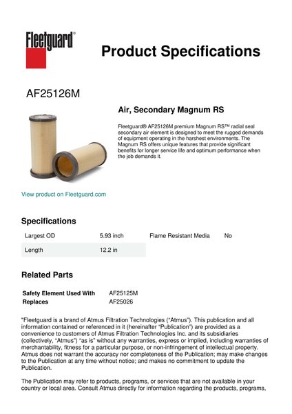 Fleetguard® AF25126M premium Magnum RS™ radial seal secondary air element is designed to meet the rugged demands of equipment operating in the harshest environments. The Magnum RS offers unique features that provide significant benefits for longer service life and optimum performance when the job demands it.Specification