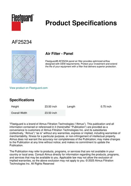 Fleetguard® AF25234 panel air filter provides optimized airflow designed with OEM requirements. Protect your investment and extend the life of your equipment with a filter that delivers superior protection.Specification