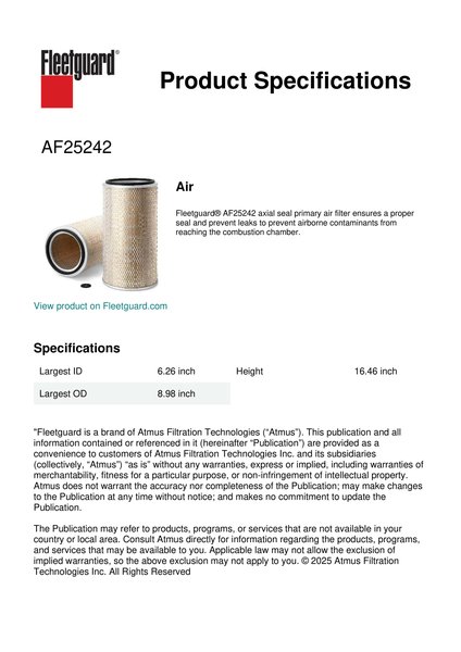 Fleetguard® AF25242 axial seal primary air filter ensures a proper seal and prevent leaks to prevent airborne contaminants from reaching the combustion chamber.