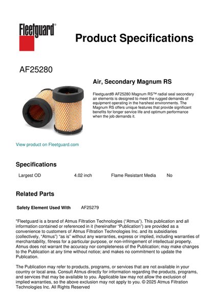 Fleetguard® AF25280 Magnum RS™ radial seal secondary air elements is designed to meet the rugged demands of equipment operating in the harshest environments. The Magnum RS offers unique features that provide significant benefits for longer service life and optimum performance when the job demands it.Specification