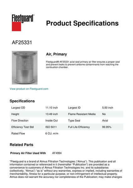 Fleetguard® AF25331 axial seal primary air filter ensures a proper seal and prevent leaks to prevent airborne contaminants from reaching the combustion chamber.