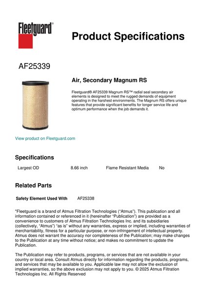 Fleetguard® AF25339 Magnum RS™ radial seal secondary air elements is designed to meet the rugged demands of equipment operating in the harshest environments. The Magnum RS offers unique features that provide significant benefits for longer service life and optimum performance when the job demands it.