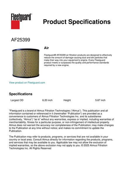 Fleetguard® AF25399 air filtration products are designed to effectively reduce the amount of damage-causing dust and dirt particles that make their way into your equipment’s engine. Every Fleetguard product meets or surpasses the quality and performance standards required by a new engine.Specification