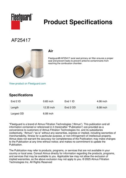 Fleetguard® AF25417 axial seal primary air filter ensures a proper seal and prevent leaks to prevent airborne contaminants from reaching the combustion chamber.