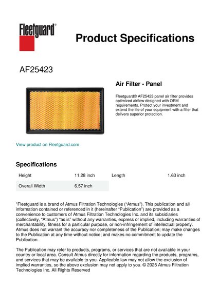 Fleetguard® AF25423 panel air filter provides optimized airflow designed with OEM requirements. Protect your investment and extend the life of your equipment with a filter that delivers superior protection.Specification