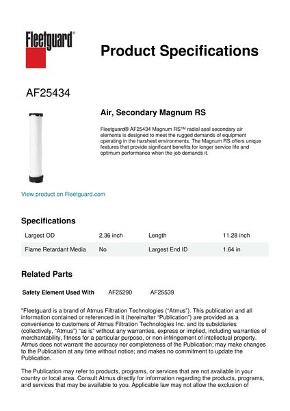 Fleetguard® AF25434 Magnum RS™ radial seal secondary air elements is designed to meet the rugged demands of equipment operating in the harshest environments. The Magnum RS offers unique features that provide significant benefits for longer service life and optimum performance when the job demands it.Specification