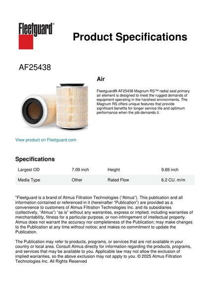 Fleetguard® AF25438 Magnum RS™ radial seal primary air element is designed to meet the rugged demands of equipment operating in the harshest environments. The Magnum RS offers unique features that provide significant benefits for longer service life and optimum performance when the job demands it.