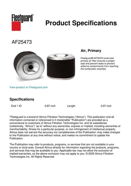 Fleetguard® AF25473 axial seal primary air filter ensures a proper seal and prevent leaks to prevent airborne contaminants from reaching the combustion chamber.