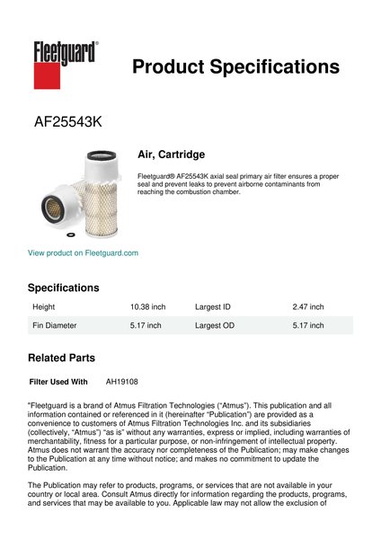 Fleetguard® AF25543K axial seal primary air filter ensures a proper seal and prevent leaks to prevent airborne contaminants from reaching the combustion chamber.