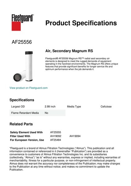 Fleetguard® AF25556 Magnum RS™ radial seal secondary air elements is designed to meet the rugged demands of equipment operating in the harshest environments. The Magnum RS offers unique features that provide significant benefits for longer service life and optimum performance when the job demands it.Specification