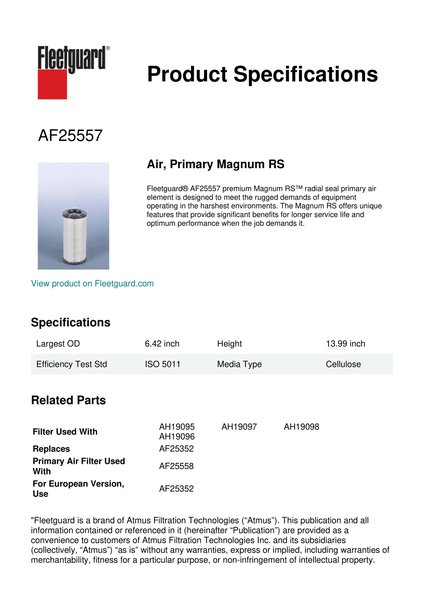 Fleetguard® AF25557 premium Magnum RS™ radial seal primary air element is designed to meet the rugged demands of equipment operating in the harshest environments. The Magnum RS offers unique features that provide significant benefits for longer service life and optimum performance when the job demands it.Specification