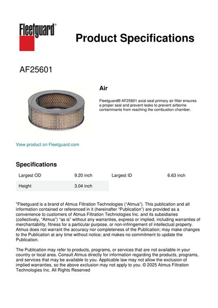 Fleetguard® AF25601 axial seal primary air filter ensures a proper seal and prevent leaks to prevent airborne contaminants from reaching the combustion chamber.