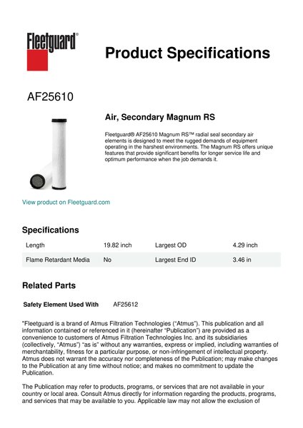 Fleetguard® AF25610 Magnum RS™ radial seal secondary air elements is designed to meet the rugged demands of equipment operating in the harshest environments. The Magnum RS offers unique features that provide significant benefits for longer service life and optimum performance when the job demands it.Specification