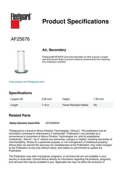 Fleetguard® AF25676 axial seal secondary air filter ensures a proper seal and prevent leaks to prevent airborne contaminants from reaching the combustion chamber.Specification