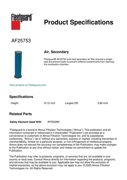 Fleetguard® AF25753 axial seal secondary air filter ensures a proper seal and prevent leaks to prevent airborne contaminants from reaching the combustion chamber.