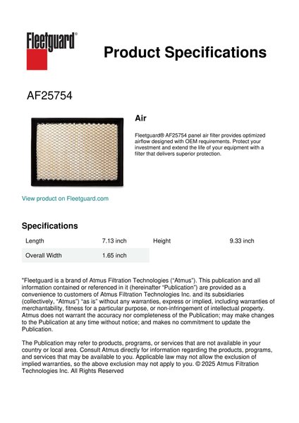 Fleetguard® AF25754 panel air filter provides optimized airflow designed with OEM requirements. Protect your investment and extend the life of your equipment with a filter that delivers superior protection.Specification